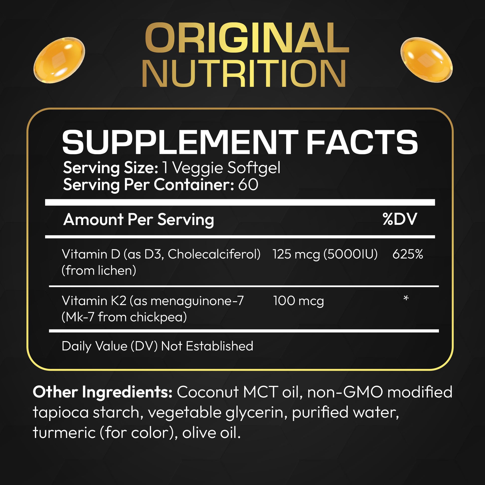 Vitamin D3 (Cholecalciferol), Vitamin K2 (MK-7), MCT Oil (from coconut), Softgel Capsule (gelatin, glycerin, purified water)